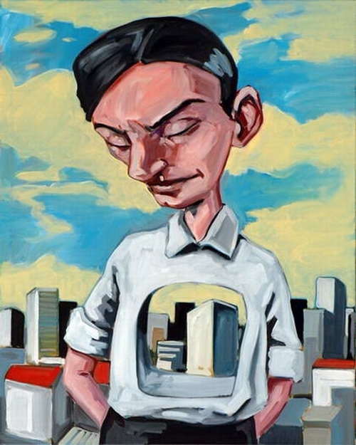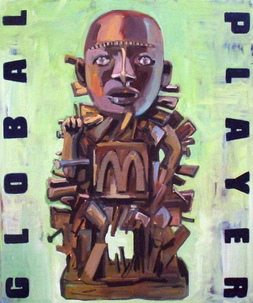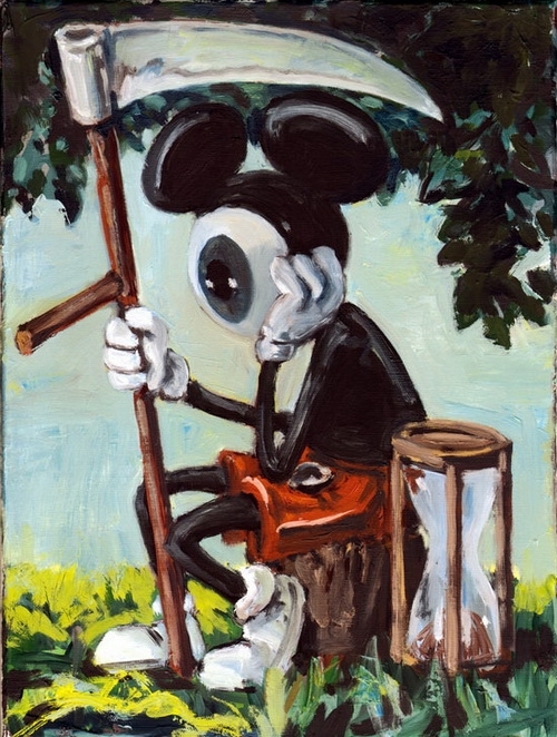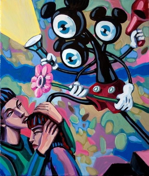 „Ich könnte alle diese Figuren sein, weibliche wie männliche“ sagt er, „außer der Globalist“. Das ist ein Allerweltskopf ohne Rumpf – weil er vom Fernsehen in Großaufnahme erfunden wurde, der überall – im Weg – herumliegt oder mal als Luftballon („Reise“, 2009) davon fliegt, an seinem Seil eine der „Kontrollmäuse“, diesen Kindern von Micky Maus, deren Kopf nur aus einem Auge besteht. Er kann sie alle verstehen und ist doch Außenstehender, was ihm eine schmunzelnd böse Distanz gibt, sie in Szene zu setzen. Aber er wehrt sich eben nicht gegen diese Verhältnisse, greift nicht ein, selbst wenn beispielsweise zwei dieser Kontrollmäuse auf der Schaukel aus ihren Verpackungskartons heraus sich mit dem Baseballschläger die Augenköpfe einschlagen wollen und drohen ihr Gleichgewicht dabei zu verlieren („Autoritätsversuch“, 2009).