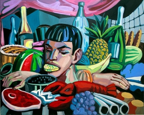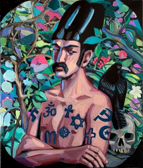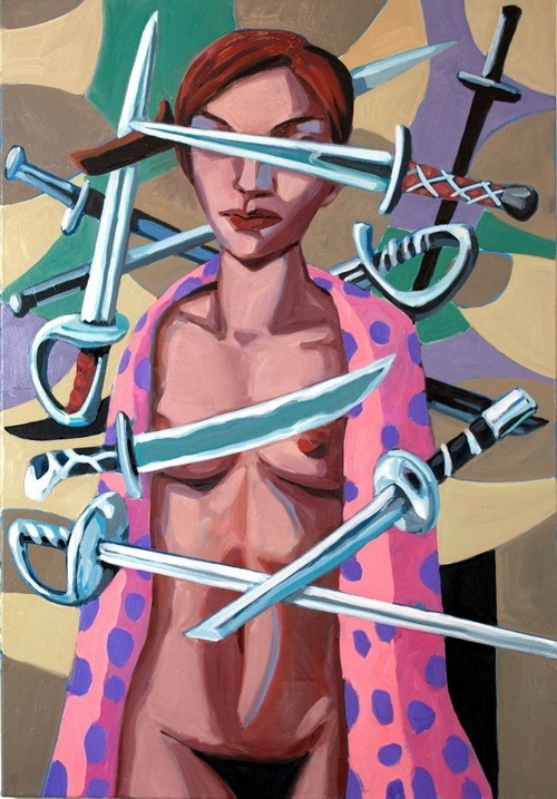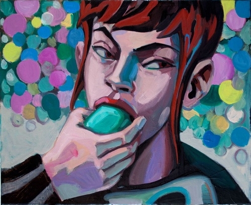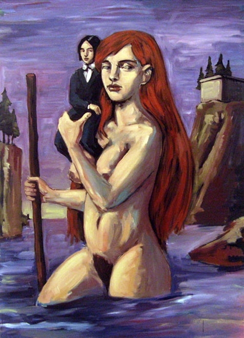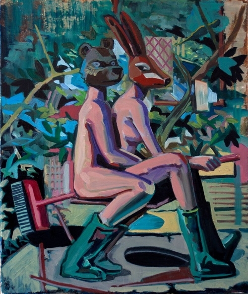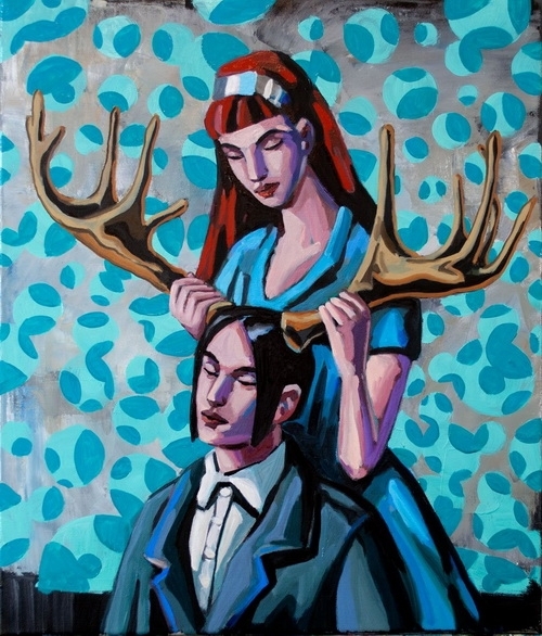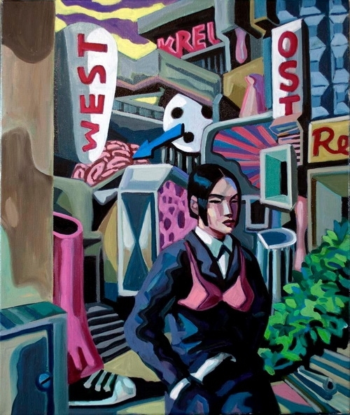 Denn in seinem umfangreichen aktuellen Bilderzyklus gibt es „Rotkäppchens Tochter“, die schwarze Wolfsohren über dem Haar trägt. Ist das ein Bekenntnis der selbstbewussten jungen Frau zur eigenen Herkunft oder ihr Programm?