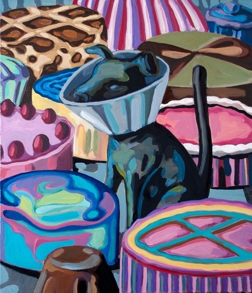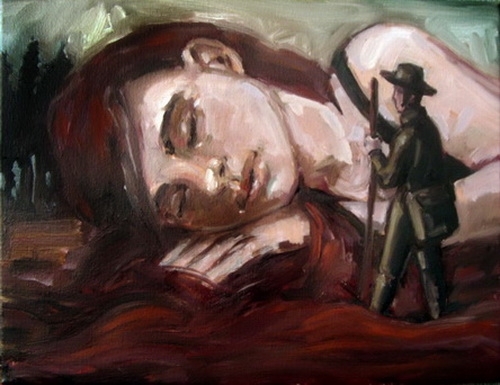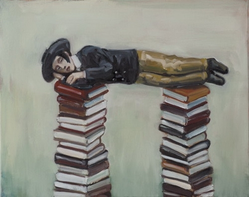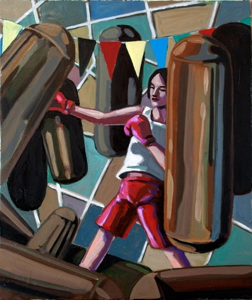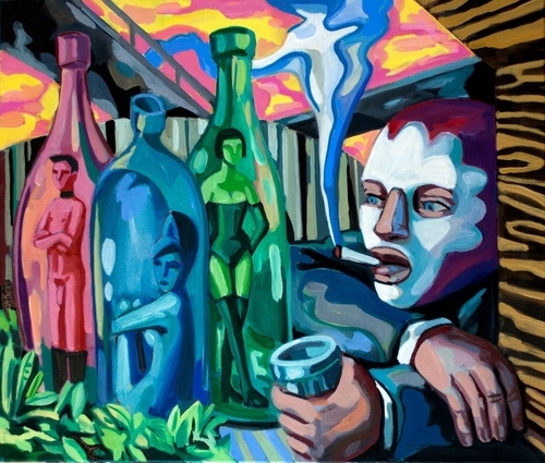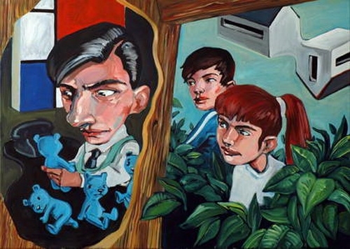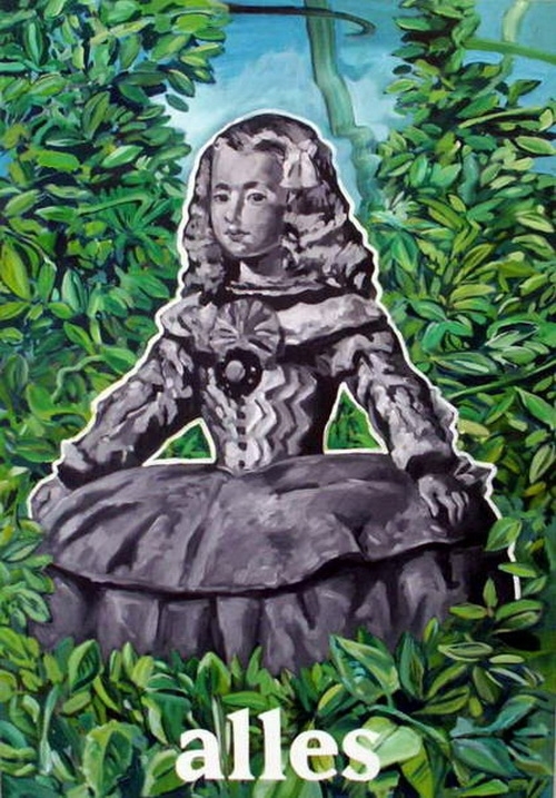 Den Bezug auf (berühmte) Bilder der Kunstgeschichte findet man öfter. „El Toro“ z.B. „…will anders sein“ (2008) und posiert in den Kleidern von Tizians „Dame in Weiß“, und der Avantgardist grüßt, wie Courbet in seinem Selbstbildnis, die Kunstfreunde, in der Hand nicht den Hut, sondern besagtes Drei-Punkte-Bild („Guten Tag, Herr Avantgardist“, 2009). Und wenn auch Joseph Beuys seinen Filzmantel und Spazierstock nach getaner Arbeit an den Nagel hängt („Feierabend“, 2008), ist das kein Nachbild, sondern dann ist die Kunst tatsächlich im Alltag und beim Volk angekommen. Dann sind all diese Situationen und ihre Personen gleichberechtigte Ikonen eines kollektivierten Gedächtnisses – als Fortsetzungsserie. Und der Wolf – das hat das Märchen nicht erzählt, ist zwar in den Brunnen gefallen aber durchgetaucht bis auf die andere Seite der Erde – während das Rotkäppchen ihre Schwangerschaft ausgetragen hat.