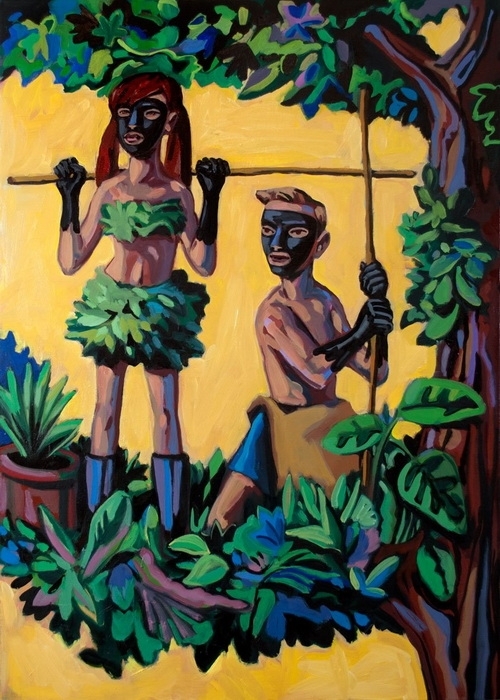 Damit sind schon drei Figuren genannt, von insgesamt zwanzig. Carsten Weitzmann nennt sie sein „Personal“. Es sind seine Stellvertreterfiguren für eine Gesellschaft, wie sie Kunst, Kulturgeschichte und Medien generiert haben. Sie beschreiben die herrschenden ideologischen Systeme bild-wörtlich und schreiben sie fort. Aus der Erfahrung mit der „bananenlosen Republik“, so der Titel eines Bilderfrieses über seine Kindheit in der DDR, und dem System des Kapitalismus heute hat er sie entwickelt, jetzt führen sie ihn über seine Leinwände.