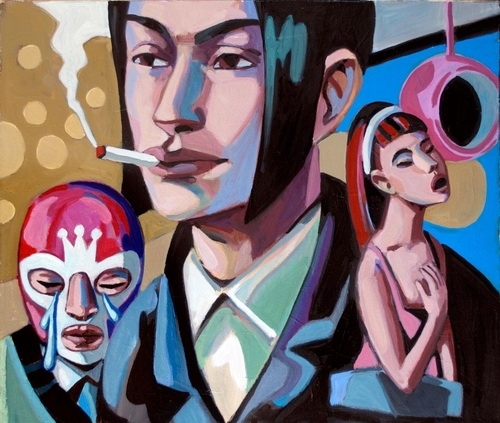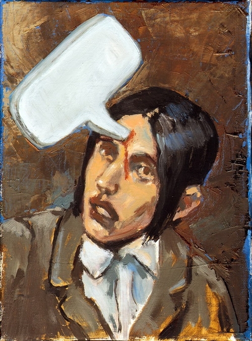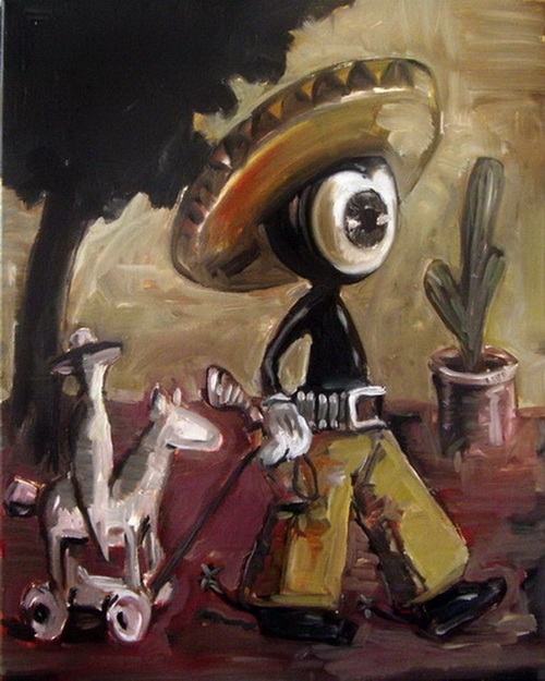 So banal, manchmal fast wie ein Bilderwitz, die Szenen sind, so doppelbödig sind sie. Was soll man dazu sagen, wenn „Die Krankenschwester“ „El Toro“, den maskierten starken Mann mit dem phallischen Kaktus unterm Arm („El Toro hat Erfolg bei den Frauen“, 2008), von hinten nimmt („Demonstration“, 2008) oder wenn „der Freund der Schwerkraft“ die Zunge des jungen Philosophen einfach festnagelt („Der Freund der Schwerkraft war hier“, 2008)? Doppelbödig irritiert ist auch dessen etablierter Kollege, der mit der Taschenlampe durchs Dunkel („Die Entdeckung, 2008“) geht, vor sich einen Lichtkegel, der an seinem Ende einen Kreis bildet, in dem drei schwarze Punkte die Blindheit markieren. Oder ist das eine Parodie auf das schwarze Quadrat von Kasimir Malewitsch? Denn dieses (ins Schwarzweiß übertragene) Blindenzeichen hält auch „Der Avantgardist“ als Leinwand vor seinen Kopf und „… gibt sich minimalistisch“ (2008).